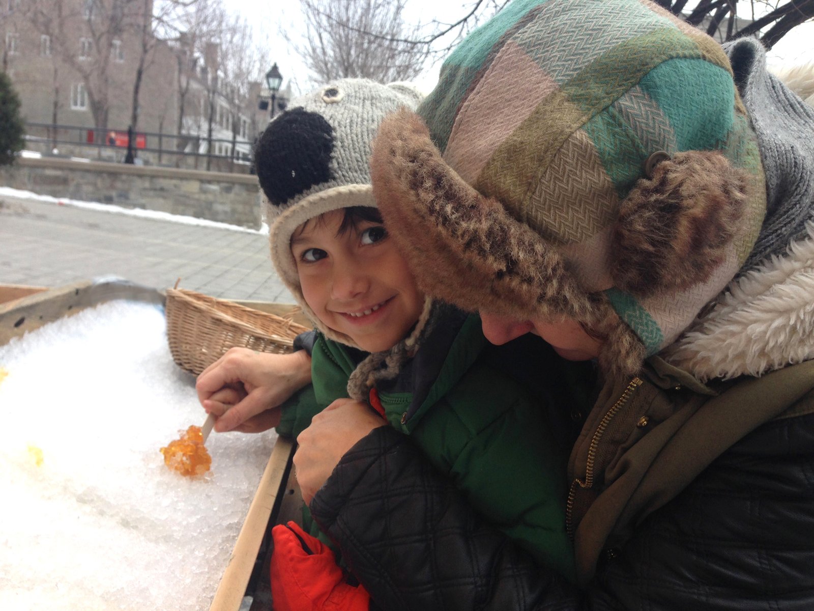 One of my son’s favorite things about Quebec is making maple syrup snow taffy. You’ll find stands on the street where they’ll pour a strip of warm maple syrup onto fresh snow, and you take a popsicle stick and roll up your own candy. I must admit that it’s one of my favorite things too!