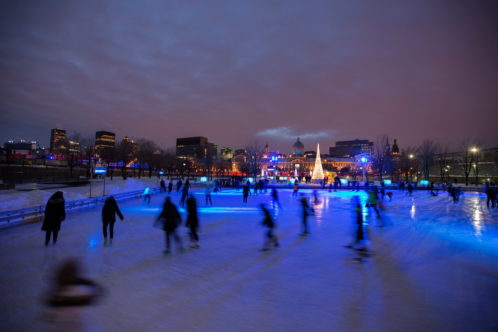 The skating rink at the Old Port. Photo by Maurice HaddadSkating in Montreal at dusk. View from the Old Port of Montreal.