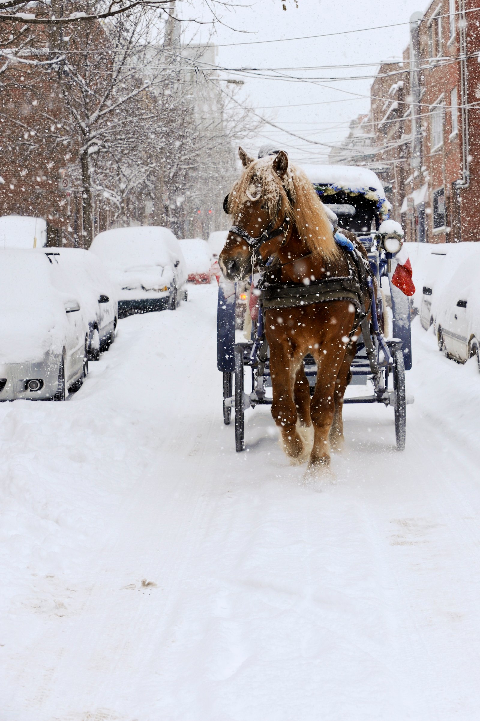 A horse drawn carriage in the streets of Montreal during a snowstorm.