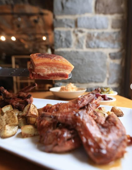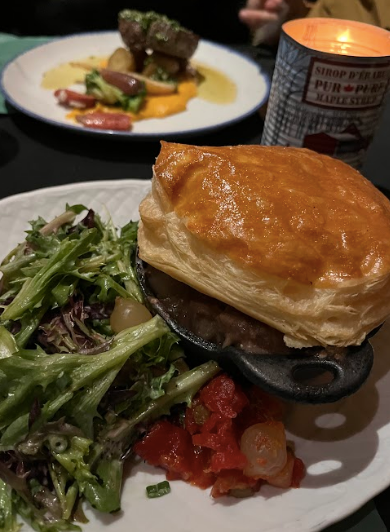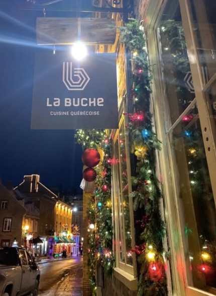 We had done our research before our trip to Quebec City and booked a table at La Buche weeks in advance, and boy, are we glad we did! Every time we walked by, there was a huge line snaking out the door. We initially thought, “Wow, those poor people, just chasing the latest hype,” but after eating there, we completely understood. La Buche was, hands down, our favorite restaurant in the whole city. It’s designed to feel like a traditional sugar shack, which added so much to the atmosphere. It felt like stepping back in time; it was so authentically traditional. Quebecois music filled the air, the place was bustling and loud, and on a chilly winter night, it felt like the place to be. It had this incredible, warm, and inviting atmosphere. My husband ordered the filet mignon, which he raved about, but my son and I went for some of the more traditional fare. We shared the French onion soup, and even my usually skeptical son had to admit it was the best he’d ever had—I completely agreed. I chose the tourtière, a traditional Christmas meat pie with venison, pork, and beef. The spices were incredible – so warm and rich. Our waitress, who was our absolute favorite during our whole trip, told us it was made with nearly a hundred different spices! And for dessert? We knew we had to try the Pouding Chômeur, or “Poor Man’s Pudding,” a classic Québécois dessert with a fascinating history. It originated during the Great Depression, and it’s essentially a light, fluffy cake soaked in a decadent maple syrup sauce. It was an absolute must – the perfect, sweet ending to a perfect meal. We walked out understanding exactly why there was always a line – La Buche isn’t just hype; it’s an experience.
